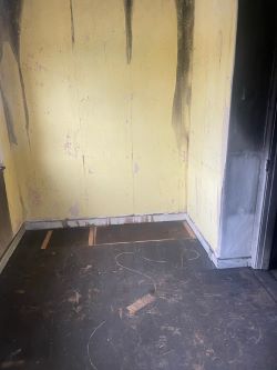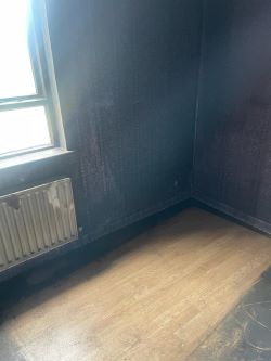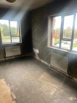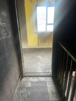 End of terrace derelict house which is fire damaged and which will require investment to make habitable.